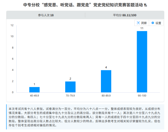 此次活动题目围绕党史发展历程、党纪重要规定等核心内容设计,旨在帮助教师进一步夯实党史党纪知识基础,增强党性修养。答题过程中,教师们利用课余时间认真作答,展现出浓厚的学习热情和良好的纪律意识。从答题结果来看,多数教师得分优异,充分体现出前期党史学习教育的扎实成效。